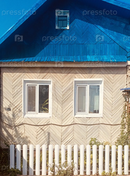 Очаровательный деревенский дом в традиционном стиле с ярко-синей крышей, представляющий собой сельское спокойствие и уютную жизнь
