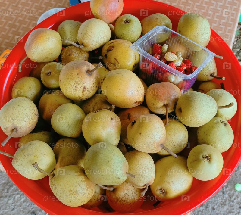 Много свежих груш и клубники в деревенском стиле в ярких цветах, представляющих здоровое питание и летний урожай
