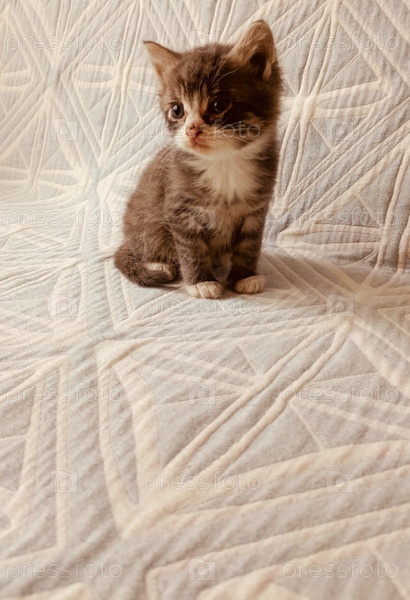 Нежный пушистый котенок с выразительными глазами, опирающийся на мягкое бежевое одеяло