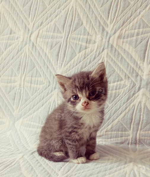 Очаровательный пушистый котенок с любопытным взглядом, сидящий на голубо-белом узоре одеяло