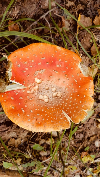 Оранжевая муха агара гриб ближайший план в теплых оттенках, представляющих красоту осеннего леса