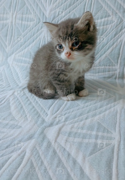 Небольшой серо-белый котенок с нежным выражением лица, представляющим невиновность на рисунковом одеяле для телят