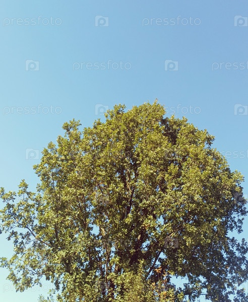 Желто-зеленый навес дерева внизу в естественном стиле в ярко-синих и желтых оттенках, представляя лето и спокойствие с копировальным пространством