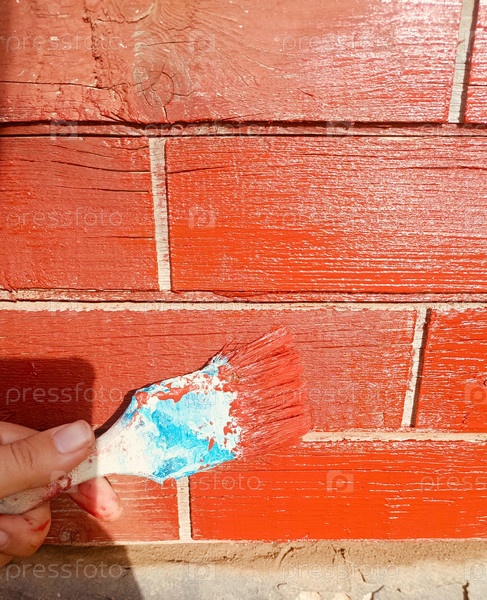 Рука с кистью наносит красную краску на деревянную поверхность, что представляет собой DIY и ремонт