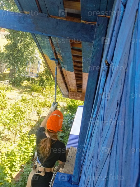Сосредоточенный мужчина в жесткой шляпе красит голубые карнизы дома среди зеленого двора