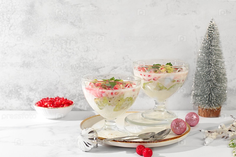 Рождественские и новогодние блюда. приправы из киви и граната на ярком праздничном столе, идея для оформления еды и украшения новогодних блюд. баннер для экрана, шаблон для творчества