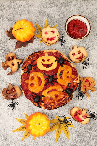 Страшная пицца с помидорами, колбасами, призраками и тыквами из сыра и оливков на старом бетонном фоне, реклама кафе и меню, визитная карточка ресторана, концепция еды для Хэллоуина
