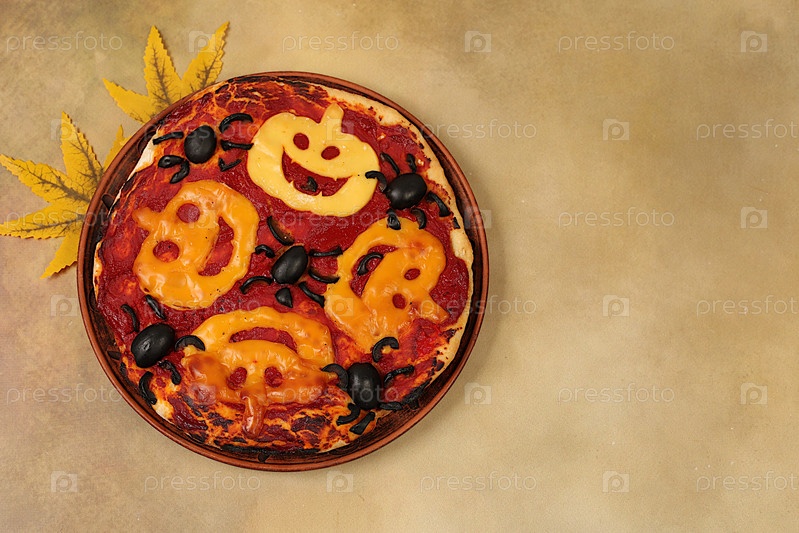 Страшная пицца с помидорами, колбасами, призраками и тыквами из сыра и оливков на старом бетонном фоне, реклама кафе и меню, визитная карточка ресторана, концепция еды для Хэллоуина