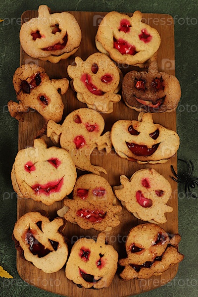 Страшные призрачные печенье, привидения и тыквы на старом бетонном фоне, реклама кафе и меню, визитная карточка ресторана, концепция еды Хэллоуина, идея приготовления праздничных блюд для детей и взрослых