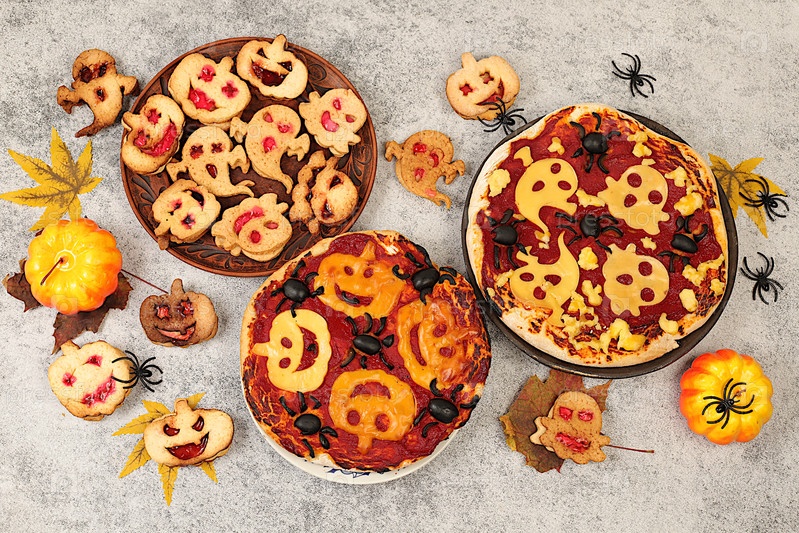 Концепция еды Хэллоуина, идея праздничной пищи для детей и взрослых: пугающие пиццы и печенье в виде монстров и призраков на старом бетонном фоне, реклама в кафе и меню