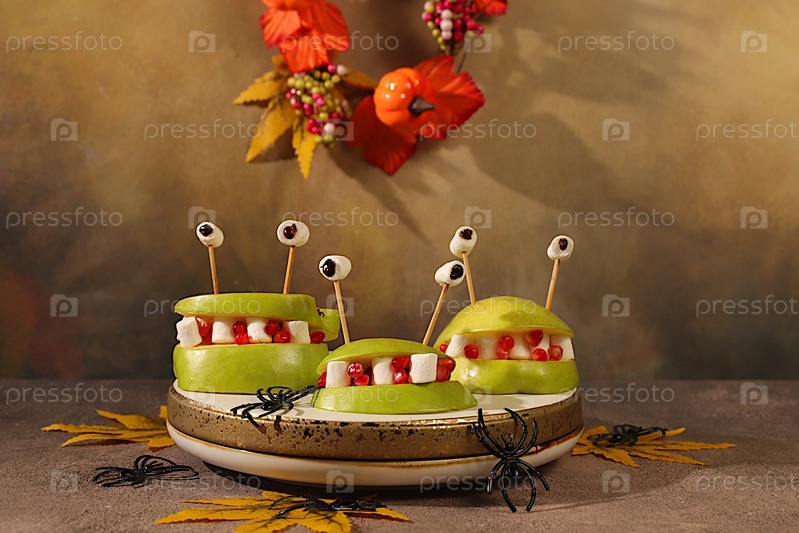 Ужасные монстры и призраки, сделанные из яблок с зубами от семян граната и зефира на старом бетонном фоне, реклама кафе и меню, визитная карточка ресторана, концепция еды Хэллоуина