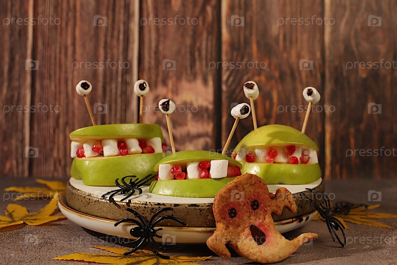 Ужасные монстры и призраки из яблок с зубами из семян граната и зефира на старом фоне, реклама кафе и меню, визитная карточка ресторана, концепция еды для Хэллоуина