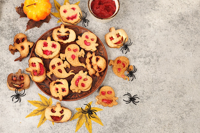 Страшные призрачные печенье, привидения и тыквы на старом бетонном фоне, реклама кафе и меню, визитная карточка ресторана, концепция еды Хэллоуина, идея приготовления праздничных блюд для детей и взрослых