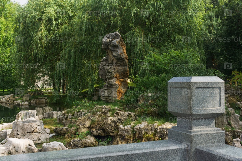 Ученый скала на берегу пруда в традиционном китайском саду