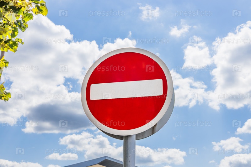 Закройте красный дорожный знак без входа под ярко-синим облачным небом