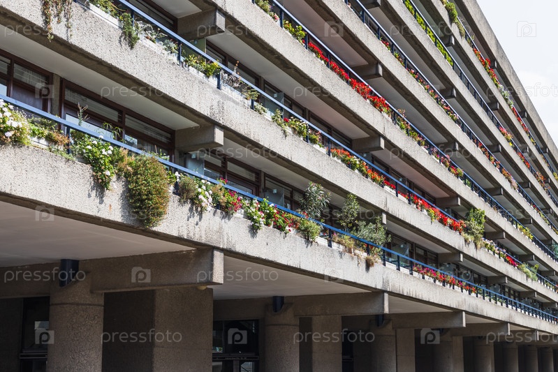 Угловой вид на Barbican Estate в Лондоне, Великобритания, показывающий слоистые бруталистские бетонные балконы с красными и синими перилами и пышными коробками для плантаторов