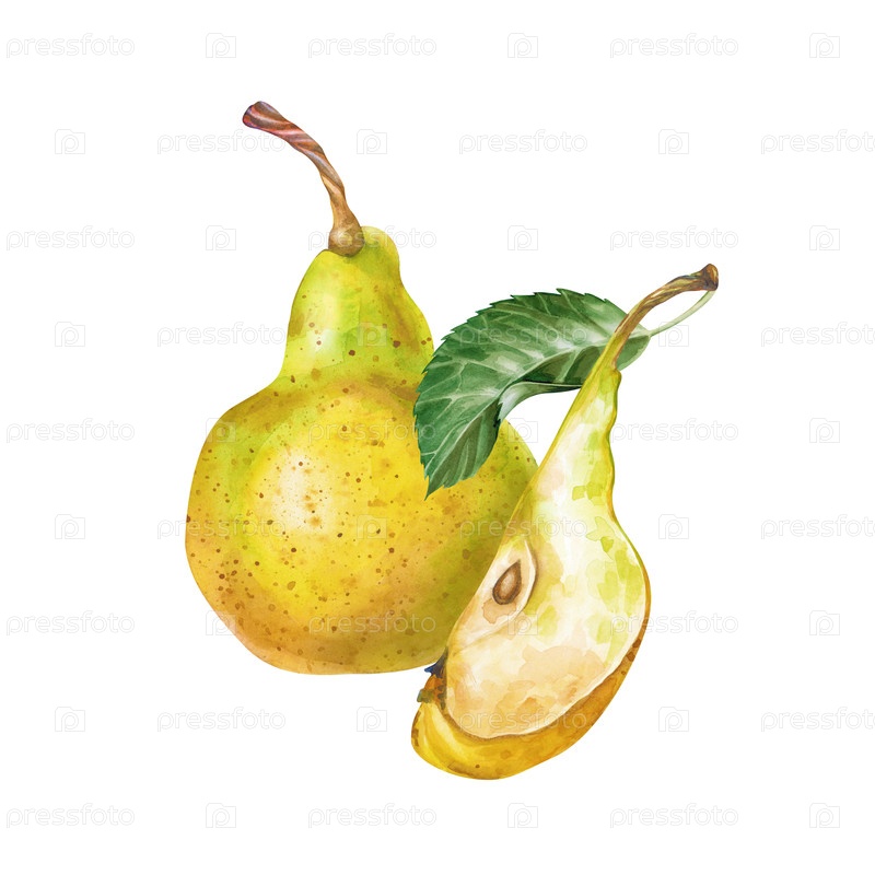 Акварельная композиция с грушами, нарисованная вручную. ботанический рисунок со всей грушей и куском спелого фрукта изолирован на белом фоне. диетические здоровые продукты: урожай