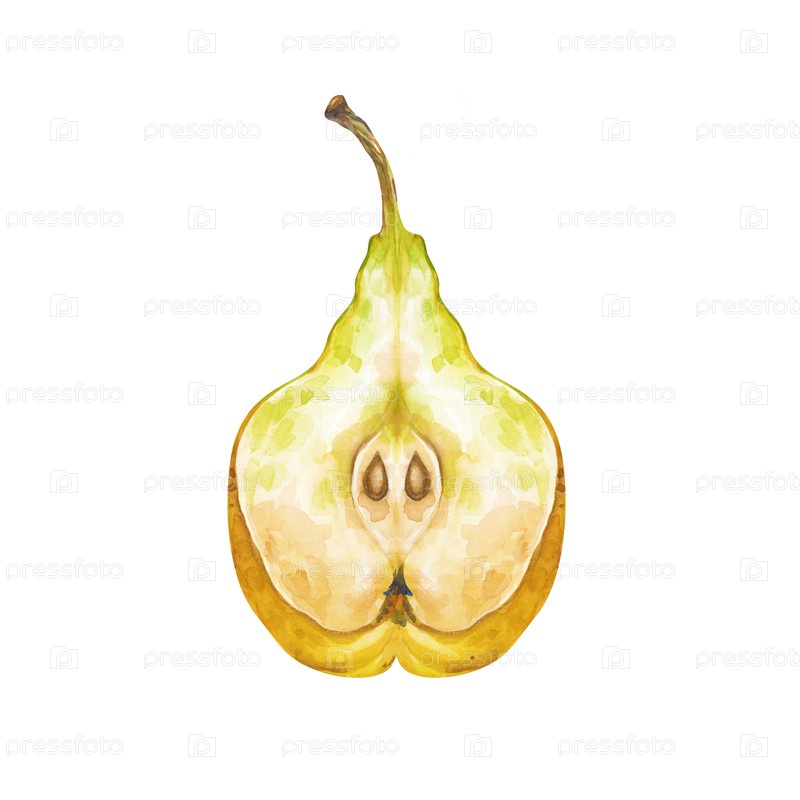 Половина сочной груши нарисована вручную. иллюстрация акварели выделена на белом фоне. желтая груша разрезана пополам стеблями и семенами. клипарт