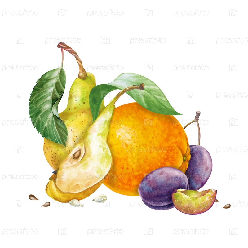 Акварельная композиция с созревшими осенними плодами, раскрашенными вручную. оранжевый, груши, сливы, зеленые листья и семена. ботаническая иллюстрация выделена на белом фоне. Осенний сад