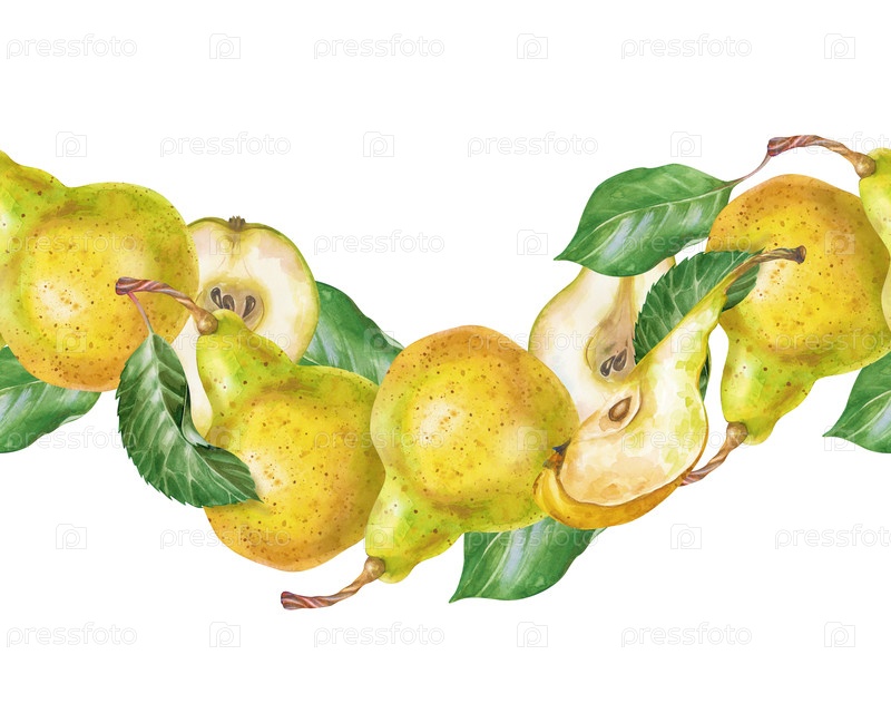 Бесшовный волнистый край спелых груш, ручной рисунок. Илюстрация акварели выделена на белом фоне. Целые груши, ломтики фруктов и зеленые листья. Ботанический шаблон для дизайна здоровой пищи и осеннего урожая темы