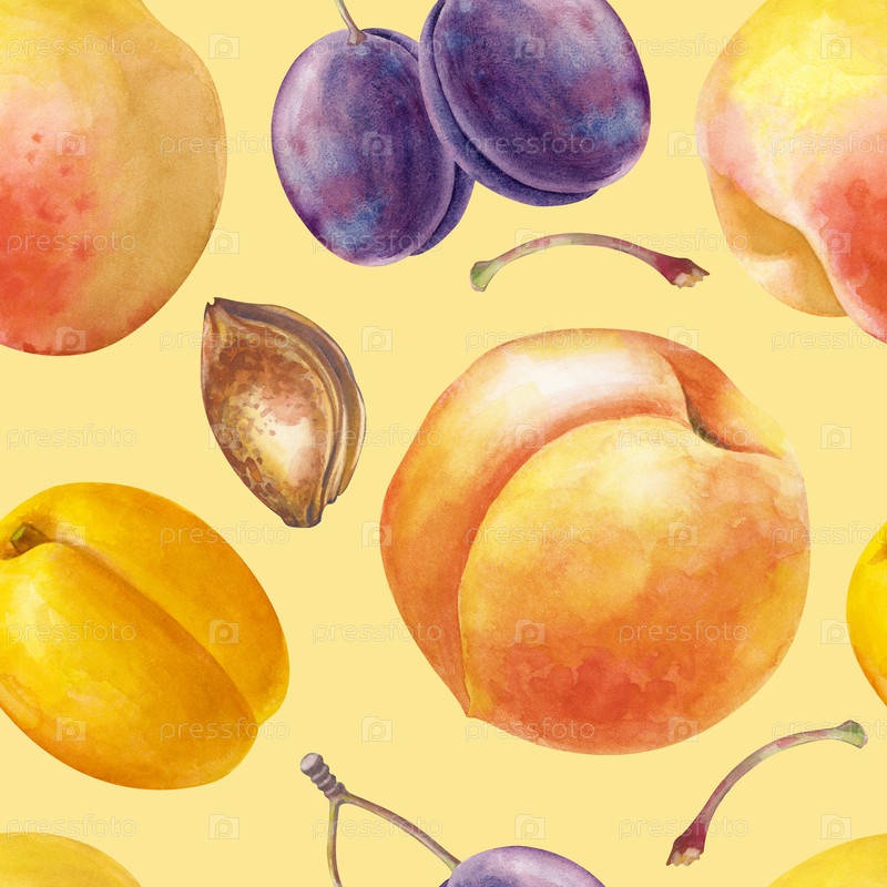 Акварельный бесшовный рисунок с сочными фруктами на желтом фоне. Персики, абрикосы, сливы с ямами и веточками. Ботанический бесшовный фон с сезонными плодами для упаковки, обоев, кухонного текстиля, посуды