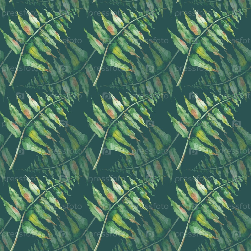 Бесшовный узор с ручным рисунком зеленого папоротника. Акварельная иллюстрация лесного растения на зелёном фоне. Для украшения лесной темы, а также упаковки, текстиля, обоев, посуды