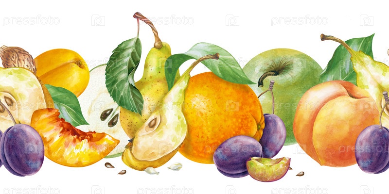 Многочисленные бесшовные границы, нарисованные вручную. Иллюстрация акварели с сезонными фруктами на белом фоне. Яблоки, груши, апельсины, сливы, персики и абрикосы. Шаблон для меню, правильного питания и приготовления пищи