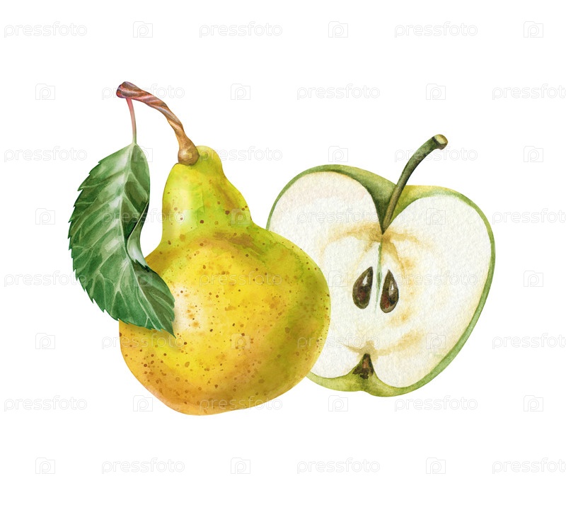 Ручно нарисованная половина яблока и груша с зеленым листом. Иллюстрация акварели выделена на белом фоне. Ботанический шаблон со сладкими сезонными фруктами для меню, садоводства и приготовления пищи