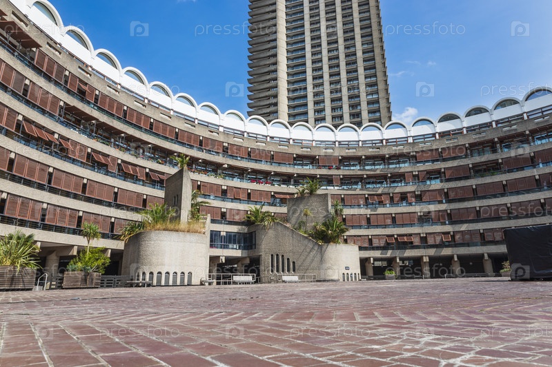 Широкий вид на поместье Барбикан в Лондоне с изогнутыми террасами, двором и башней под голубым небом
