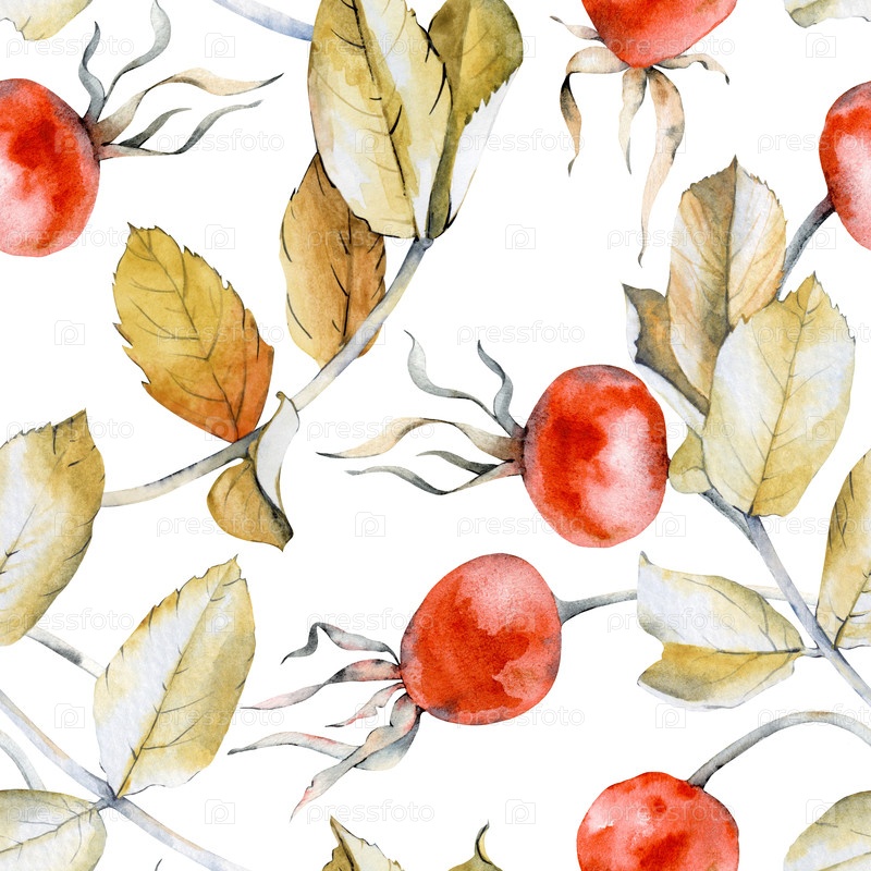 Акварель бесшовный рисунок с осенними листьями и розовыми бедрами. Ботаническая иллюстрация выделена на белом фоне. Бесшовный фон с желтыми сухими листами и красными ягодами для обоев, текстиля, посуды