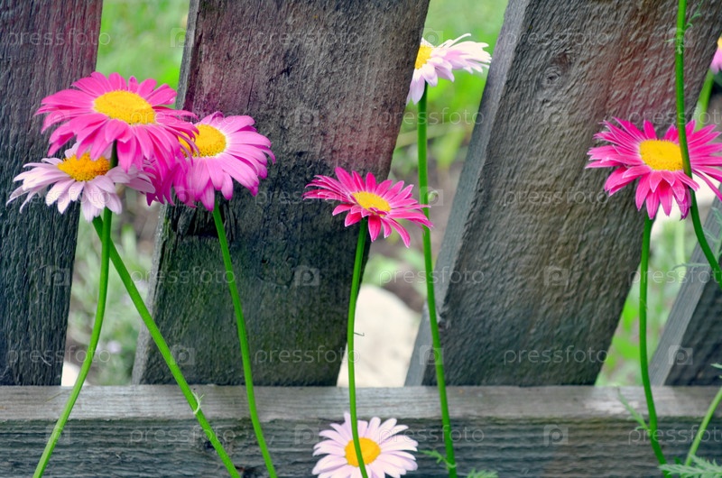 Розовый пиретрум цветет у забора