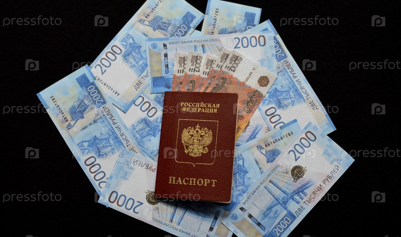 Российский паспорт и рубли на черном фоне