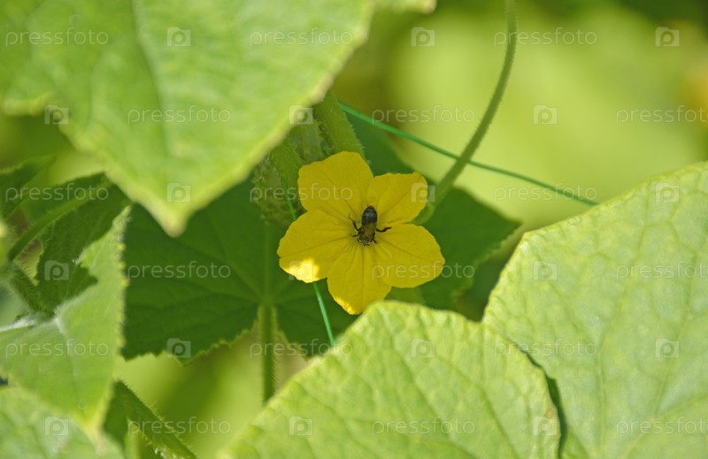 Цветок огурца, желтый цветок на ветке куста, опыленный пчелой, выращивание овощей дома, уход за природой и правильное питание, богатое витаминами