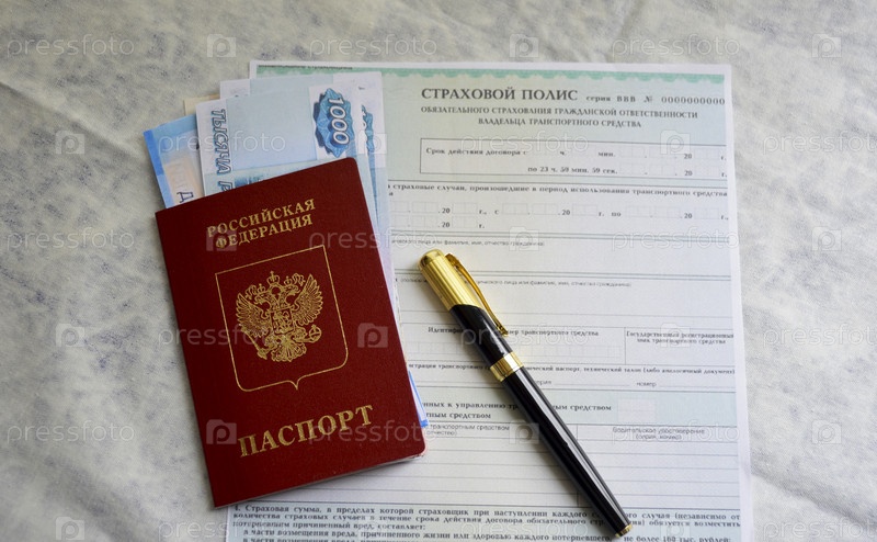 Тирасполь, Молдова - 3 апреля 2021 года: пустая форма автострахования, рядом с ней российский паспорт и пакет банкнот