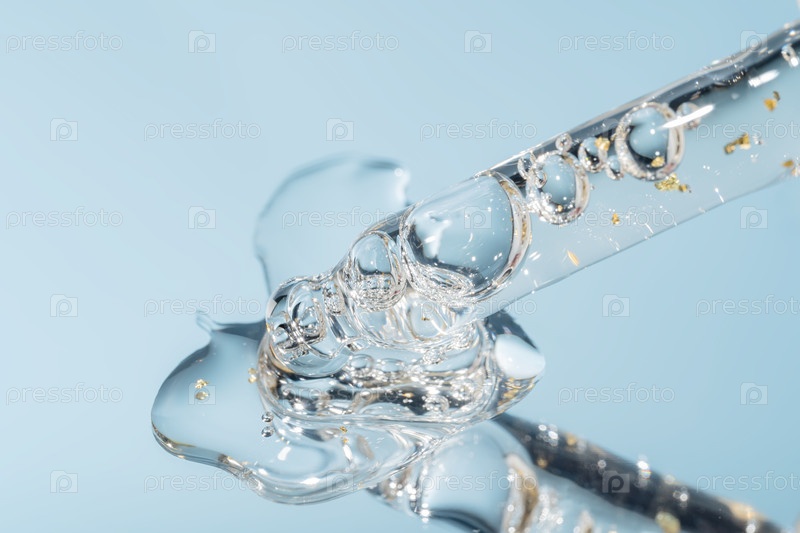 Пипетка, капли и тампоны косметики. жидкий 24-фунтовый гель или сывороточная капля на синем фоне