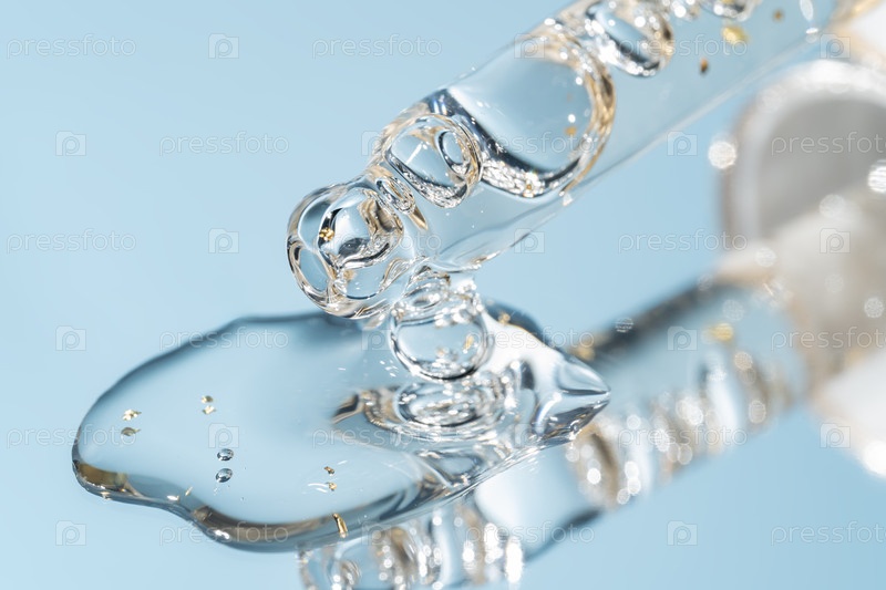 Пипетка, капли и тампоны косметики. жидкий 24-фунтовый гель или сывороточная капля на синем фоне