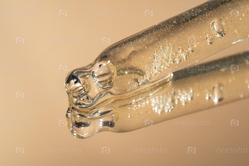 Бутылка капельницы закрывается и жидкий желто-оранжевый ретинол или гель витамина С или сыворотка на бежевом фоне