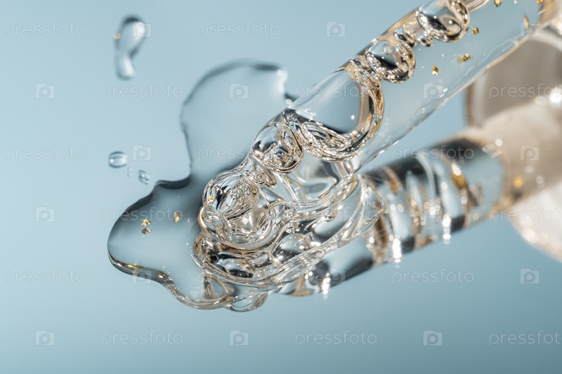 Косметическая пипетка с маслом на синем фоне крупный план. Стильная концепция органических эссенций, продуктов красоты и здоровья. Современная аптека. Близкий