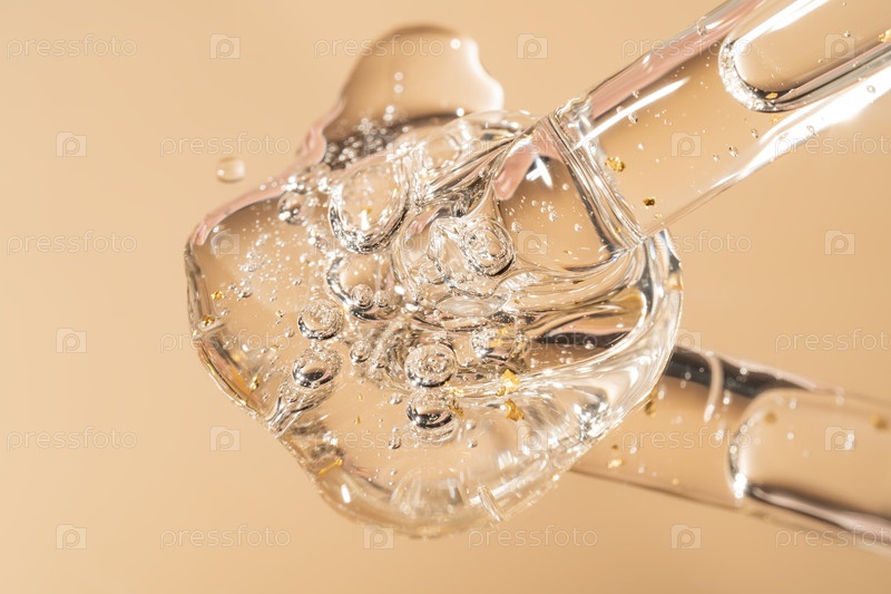 Золотая красавица длиной 24 км сталкивается с маслом, капающим из золотой капли на бежевом фоне.Косметическая реклама по уходу за кожей с копировальным пространством