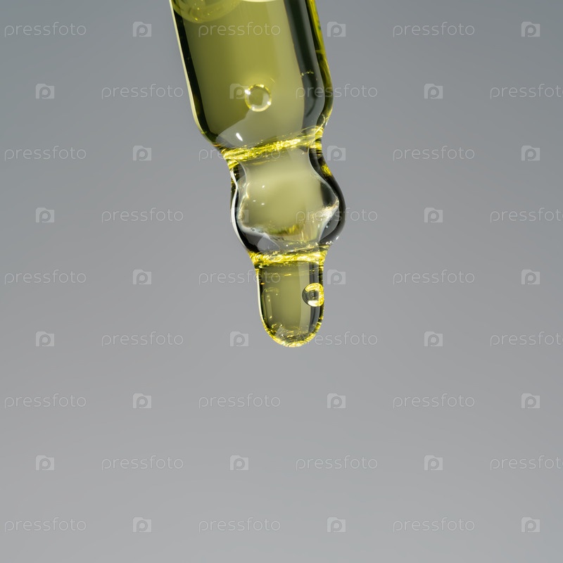 Капли масла капают из пипетки в косметическую бутылку, закрытую и изолированную на сером фоне. презентация продукта по уходу за кожей