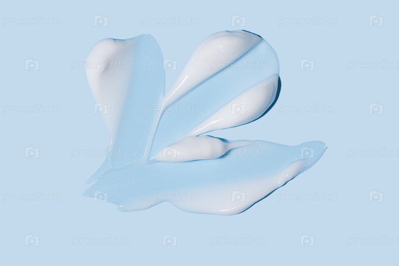 Белая текстура косметических кремов, лосьон по уходу за кожей на пастельно-синем фоне. Крем для лица, увлажнитель тела, волосатый тампон. Кремовый косметический продукт Closeup