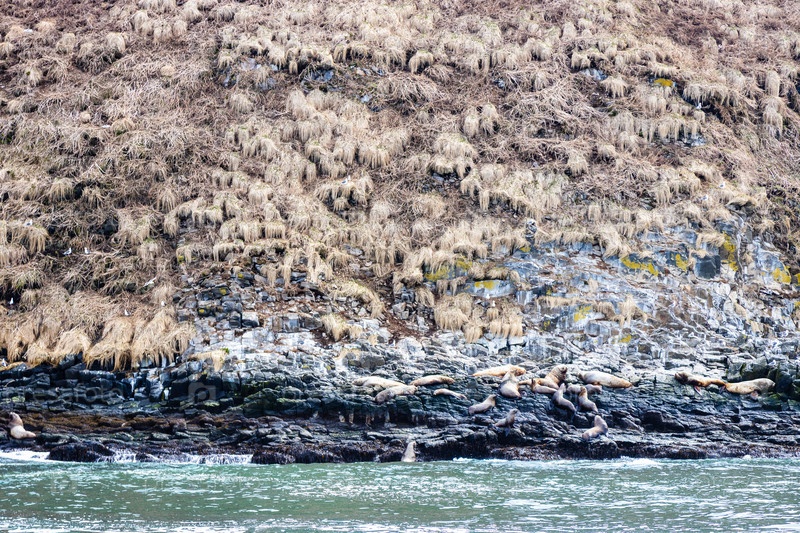 Тюлени на острове в бухте Авака-Тихоокеанский
