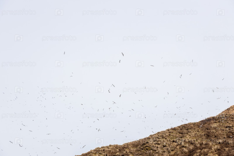 Многие морские птицы летают над островом в бухте Авача
