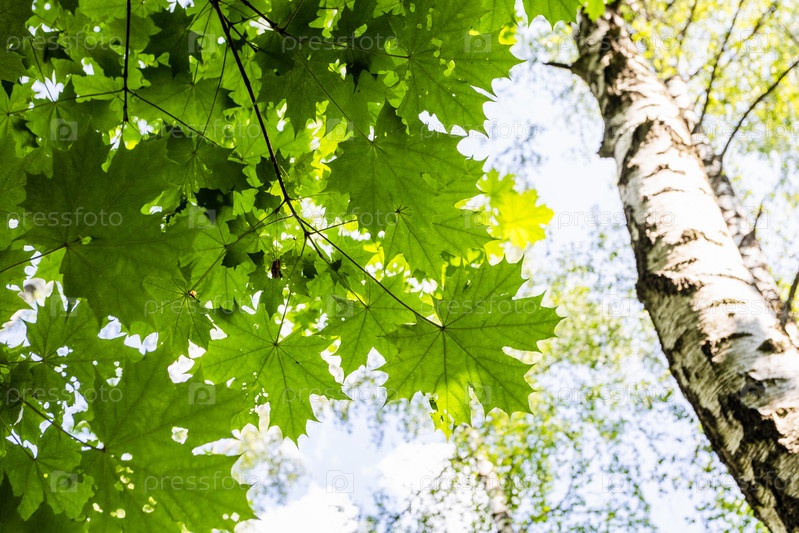 Нижний вид кленовых листьев и белой березы