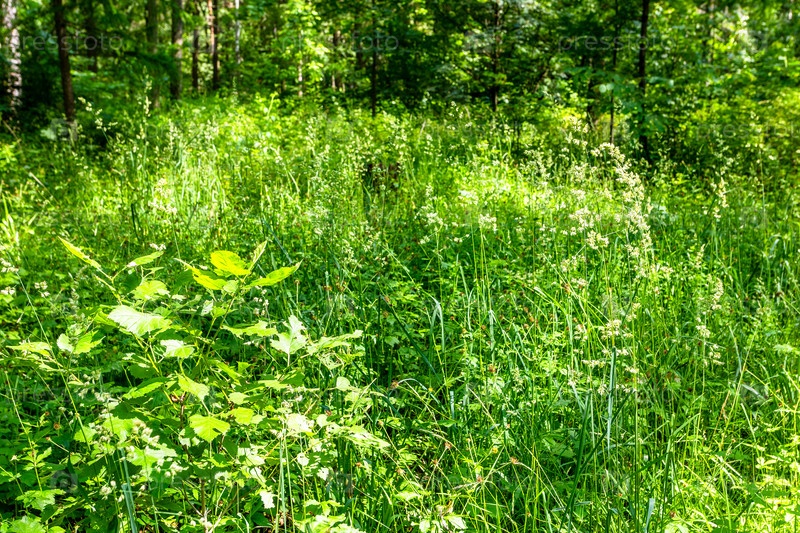 Высокая зеленая трава в переросшем лесу летом