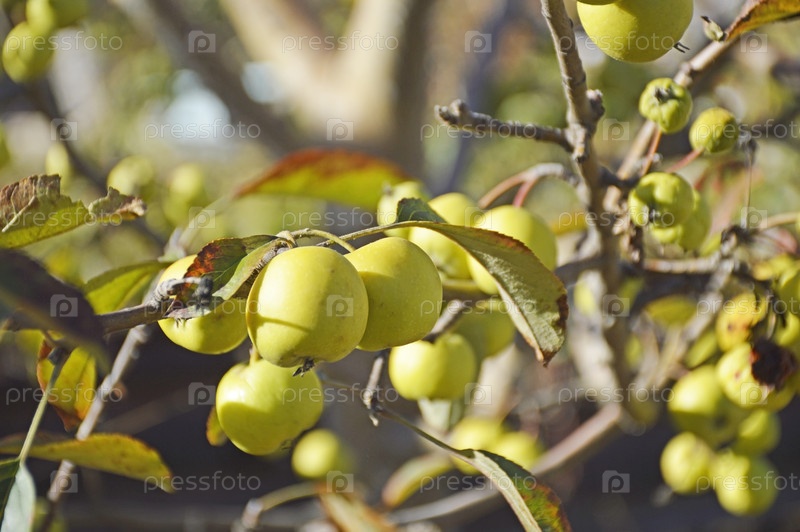 Маленькие яблоки на ветвях деревьев в саду. сбор декоративных яблок на деревьях в городском парке. время жатвы для здоровых и вкусных фруктов