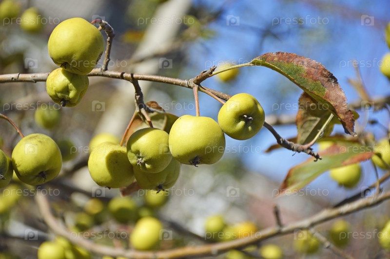Маленькие яблоки на ветвях деревьев в саду. сбор декоративных яблок на деревьях в городском парке. время жатвы для здоровых и вкусных фруктов