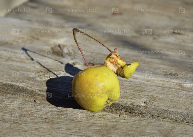На ветке находится одно маленькое целое яблоко и зерно.Фруктовая культура, садоводство.Урожай яблок. Плохой урожай