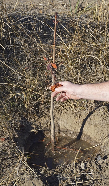 Осень, приземление конского каштана. Человеческая рука поместила саженец будущего дерева в дыру, заполненную водой. Посадка деревьев. Борьба за экологию, озеленение планеты