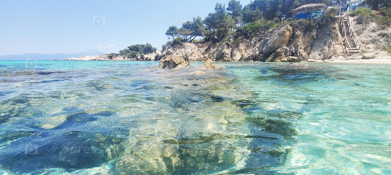 Дикий пляж у моря, чистый и мягкий песок, чистая вода и большие камни, отдых на море или океане, летние каникулы или путешествия